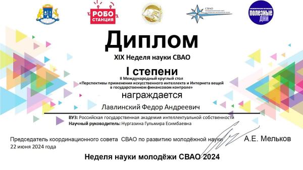 Диплом за I степени Лавлинскому Федору Андреевичу за исследовательскую работа в рамках II Международный круглый стол «Перспективы применения искусственного интеллекта и Интернета вещей в государственном финансовом контроле»