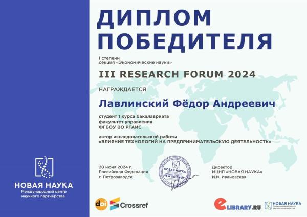 Диплом за 1 место Лавлинскому Федору Андреевичу за исследовательскую работу «Влияние технологий на предпринимательскую деятельность» на III RESEARCH FORUM 2024