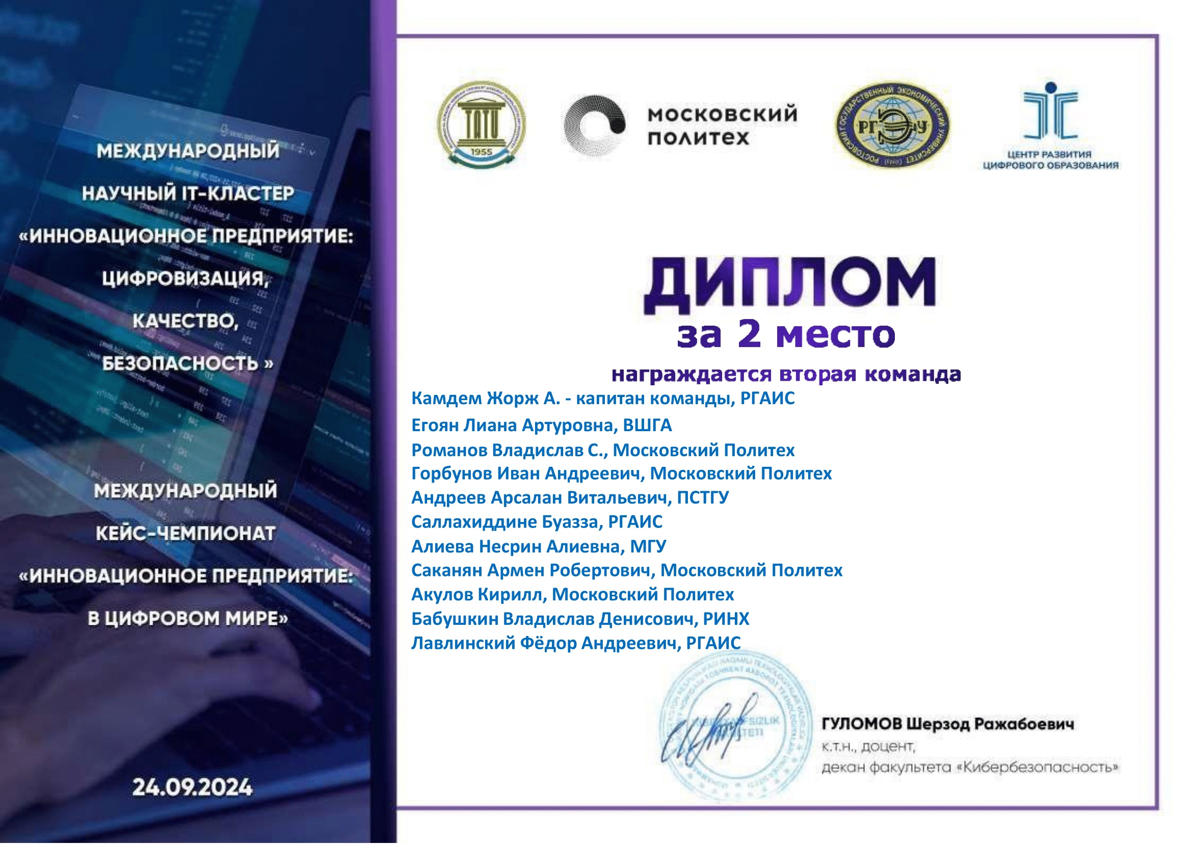 Диплом за 2 место Лавлинскому Федору, Камдем Жорж, Буазза Саллахеддин за участие в международном кейс-чемпионате «Инновационное предприятие: в цифровом мире»