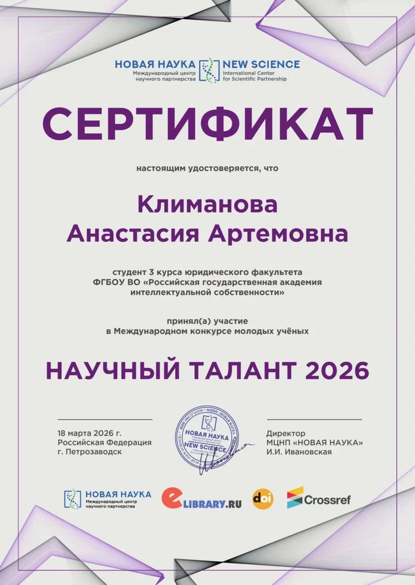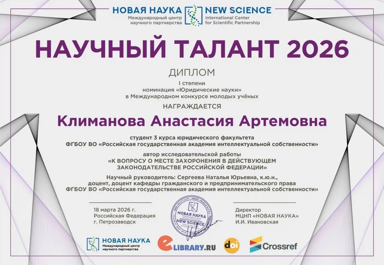 18 марта 2026 года состоялся Международный конкурс молодых ученых «Научный талант 2026». Организатор: МЦНП «Новая наука».