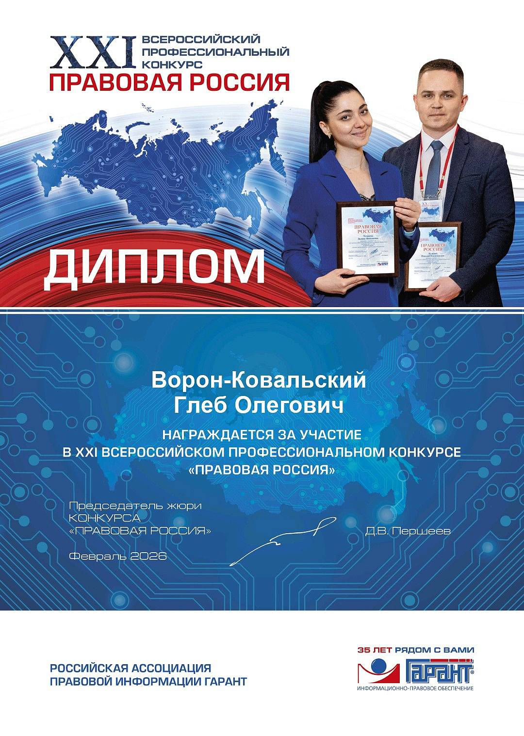 5 марта 2026 года были подведены итоги отборочного этапа ХXI Всероссийского профессионального конкурса «Правовая Россия», организатором которого выступила Российская ассоциация правовой информации ГАРАНТ.