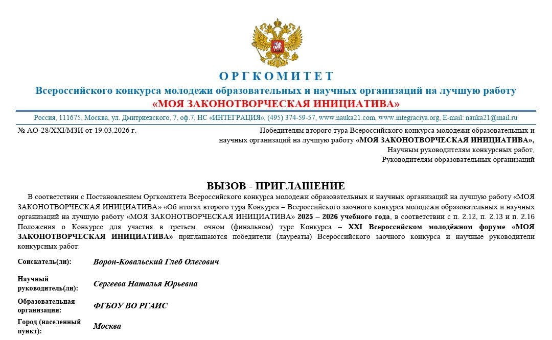 По итогам заочного (отборочного этапа) XXI Всероссийского конкурса молодежи образовательных и научных организаций на лучшую работу «МОЯ ЗАКОНОТВОРЧЕСКАЯ ИНИЦИАТИВА», прошедшего в марте 2026 года, студент 3 курса юридического факультета, руководитель орг. комитета СНО «Эксперт» – Ворон-Ковальский Глеб стал лауреатом и приглашен в очный (финальный) этап, где представит РГАИС уже в мае 2026 года.