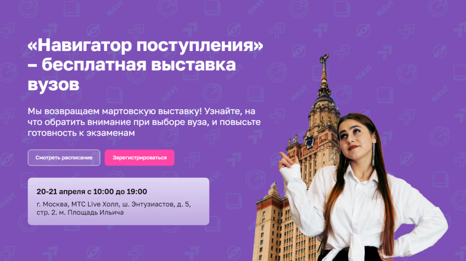 Приходите на выставку «Навигатор поступления» 20 или 21 апреля в МТС Live Холл, в которой РГАИС принимает участие, и вы сможете задать специалистам приемной комиссии все вопросы о правилах поступления, проходных баллах и студенческой жизни.