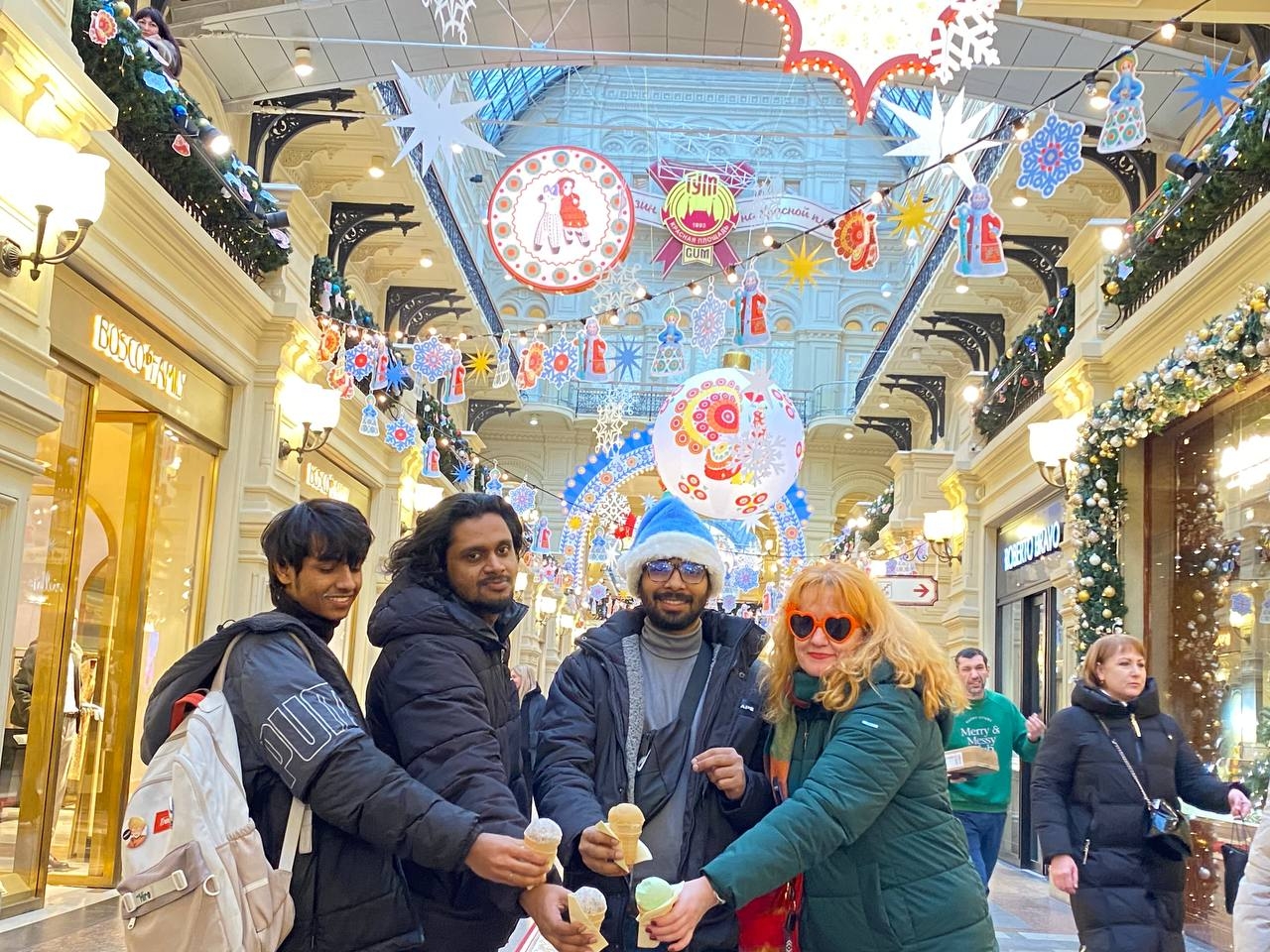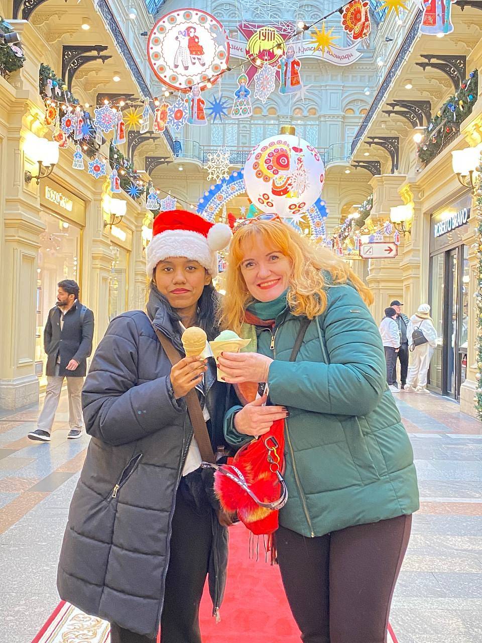 Истинный восторг у студентов вызвало знаменитое Гумовское мороженое! Его кремовый вкус на фоне исторических сводов — это уже не просто десерт, а настоящая московская традиция, которой уже более 70 лет. Технология производства по-прежнему включает ручную работу. Этот день стал для ребят живым доказательством, что Москва - город, который умеет создавать праздник, объединять культуры и дарить самое искреннее новогоднее настроение.