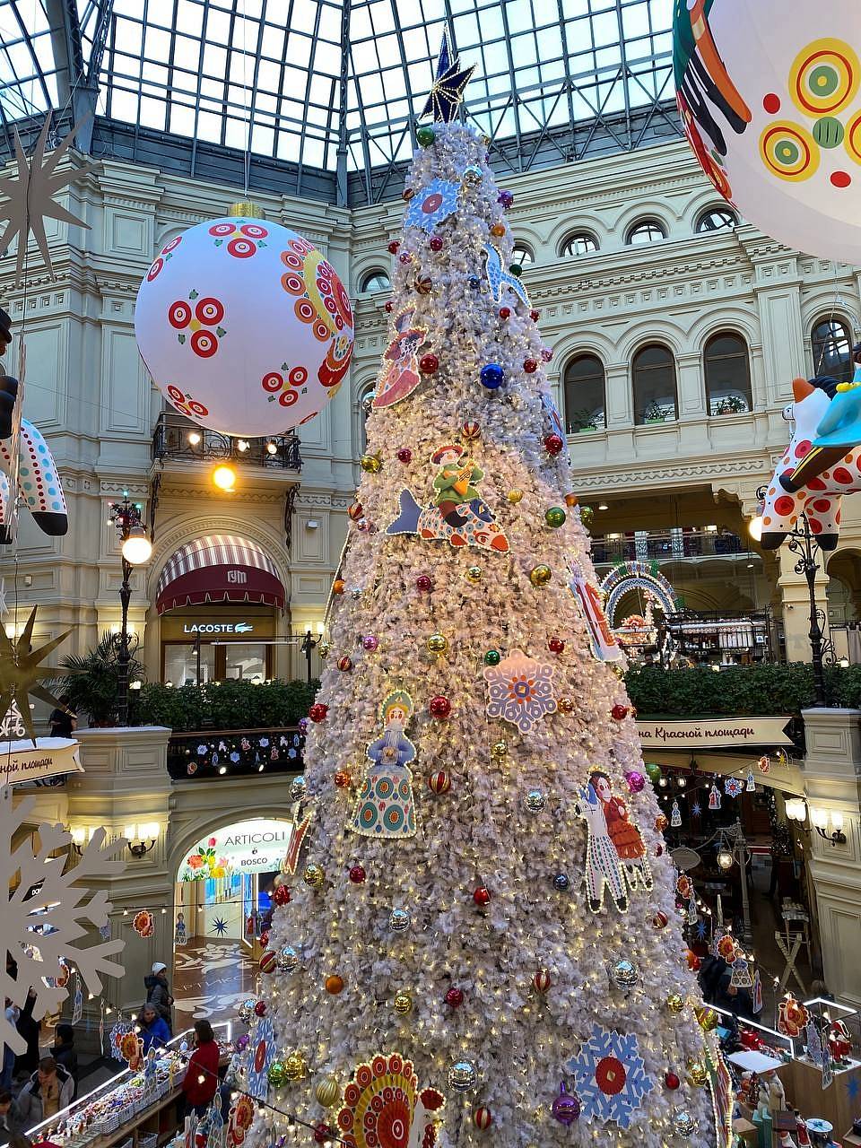 Какая в этом году красота внутри! Уникальное оформление в духе знаменитой дымковской игрушки: яркие узоры, добрые персонажи, праздничные гирлянды… Как будто попали в русскую сказку – тёплую и душевную. А в центре - величественная снежная ёлка.