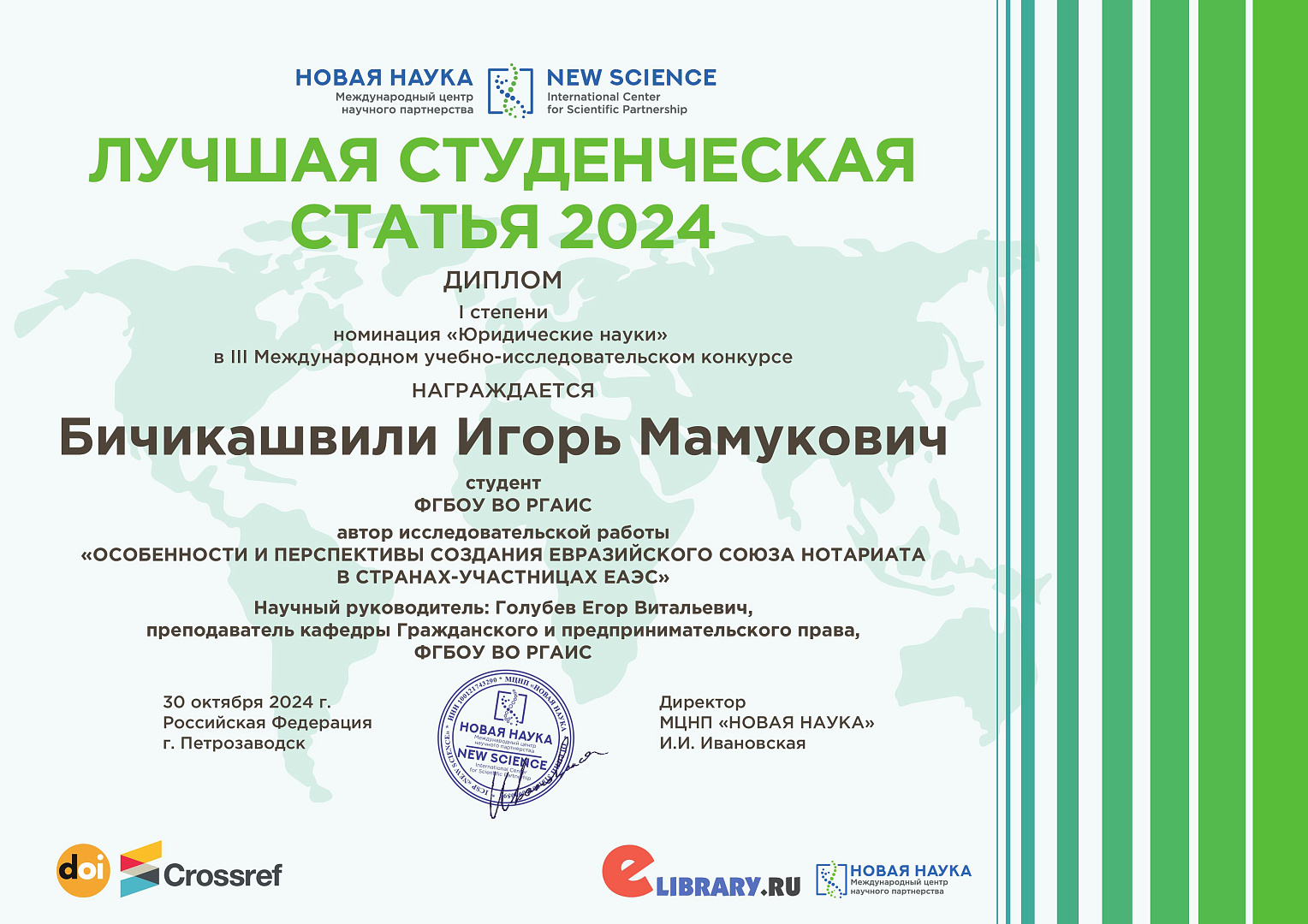 Статья Игоря «Особенности и перспективы формирования Евразийского союза нотариата» вошла в состав октябрьского номера сборника «ЛУЧШАЯ СТУДЕНЧЕСКАЯ СТАТЬЯ 2024» (научный руководитель - преподаватель кафедры ГиПП Голубев Е.В.)