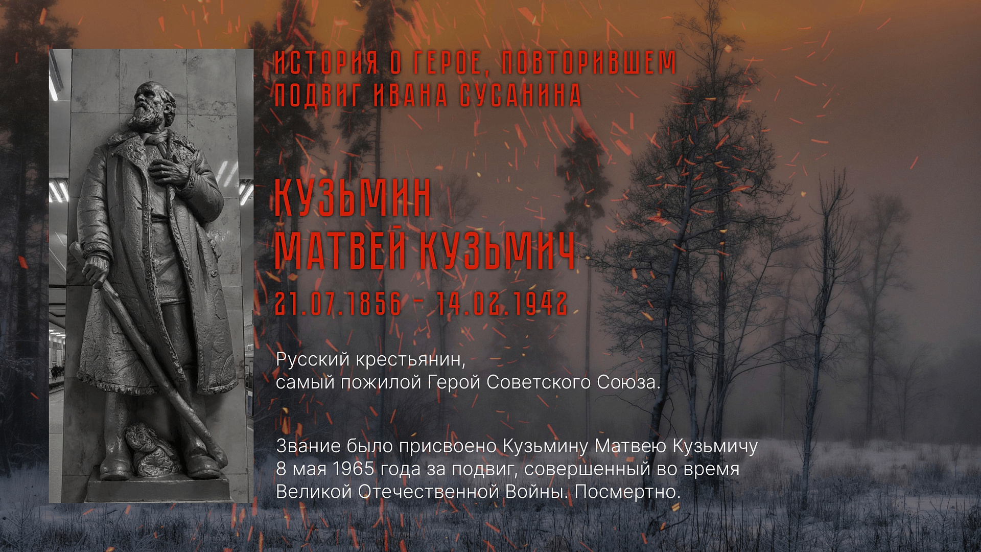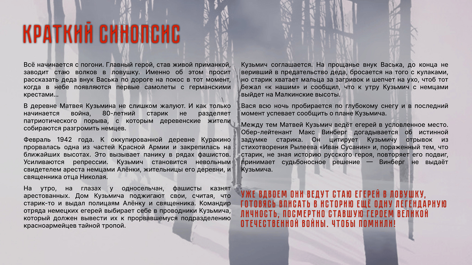 Это история самого пожилого Героя Советского Союза — Матвея Кузьмина. В феврале 1942 года в Псковской области он повторил подвиг Ивана Сусанина, ценой жизни уведя вражеский отряд в засаду. В широкий прокат картина выходит 7 мая.