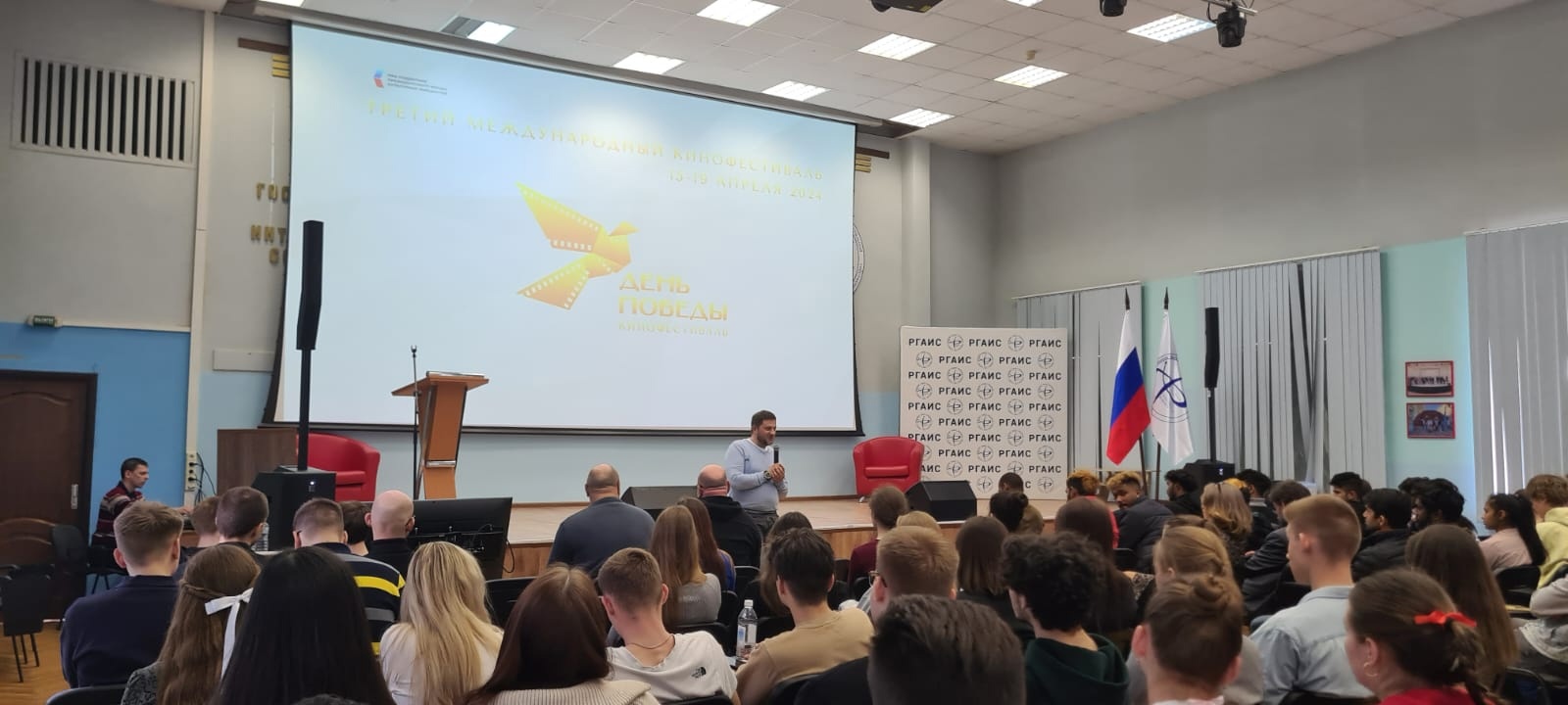 18 апреля в Актовом зале Академии состоялся второй день III Международного кинофестиваля «День Победы». Участников мероприятия приветствовали проректор по молодежной политике и внешним связям Елена Китаева и режиссер, сценарист фильма «Отцы Донбасса. Отцы и дети» Константин Зайцев.