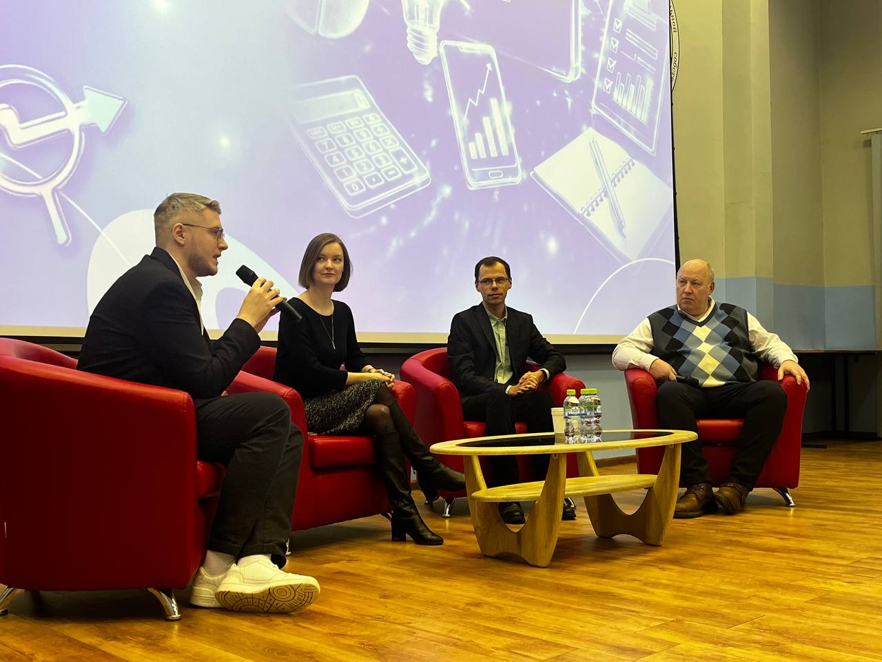 На дискуссии «Беседа с профессионалом» вопросы предпринимательства и интеллектуальной собственности обсудили профессор кафедры Гражданского и предпринимательского права Андрей Ермаков, доцент кафедры Управления инновациями и коммерциализации интеллектуальной собственности Анна Хворостяная и начальник Международного экспертного центра Геннадий Золотов, а председатель студенческого совета РГАИС Анна Марюхненко рассказала школьникам о нашей Академии.