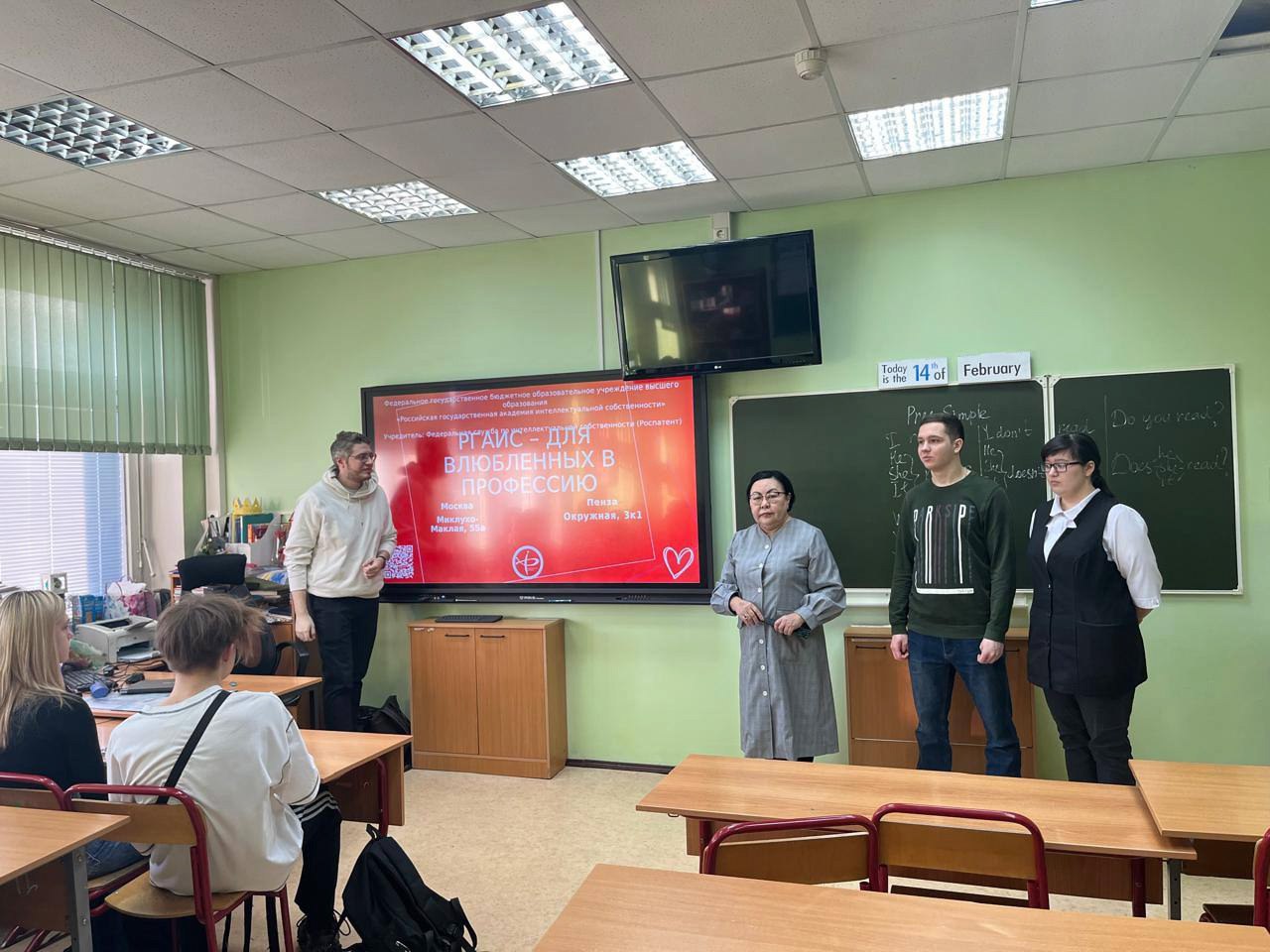 24 февраля заместитель начальника Отдела международных и просветительских проектов Г.И. Протопопов совместно с членами СНО «Эксперт» Факультета управления интеллектуальной собственностью Аленой Горячевой, Алиной Артиковой, Сергеем Лященко, Федором Лавлинским и их научным руководителем Г.Е. Нургазиной провели со школьниками 10-11 классов школы № 1981 профориентационные занятия.