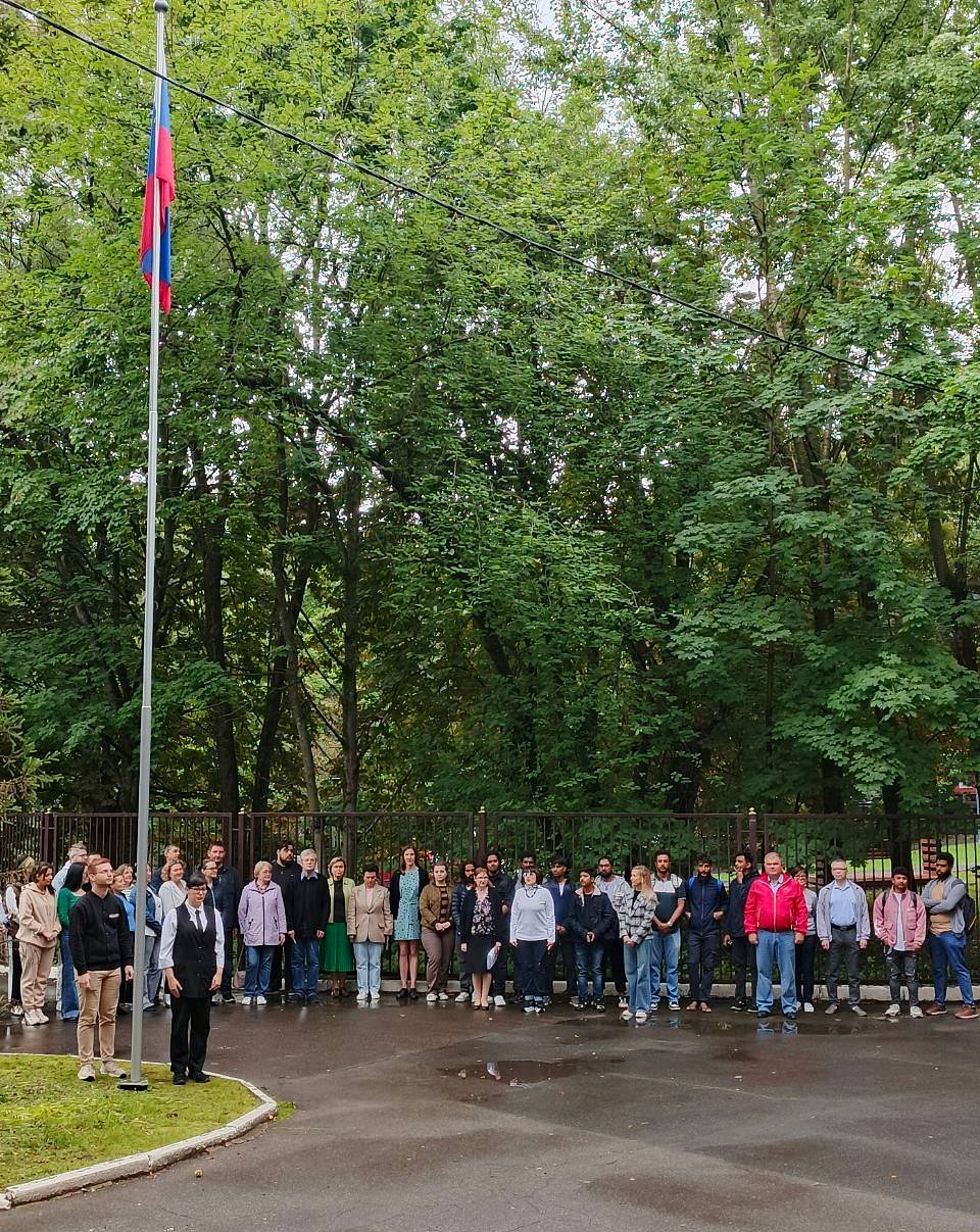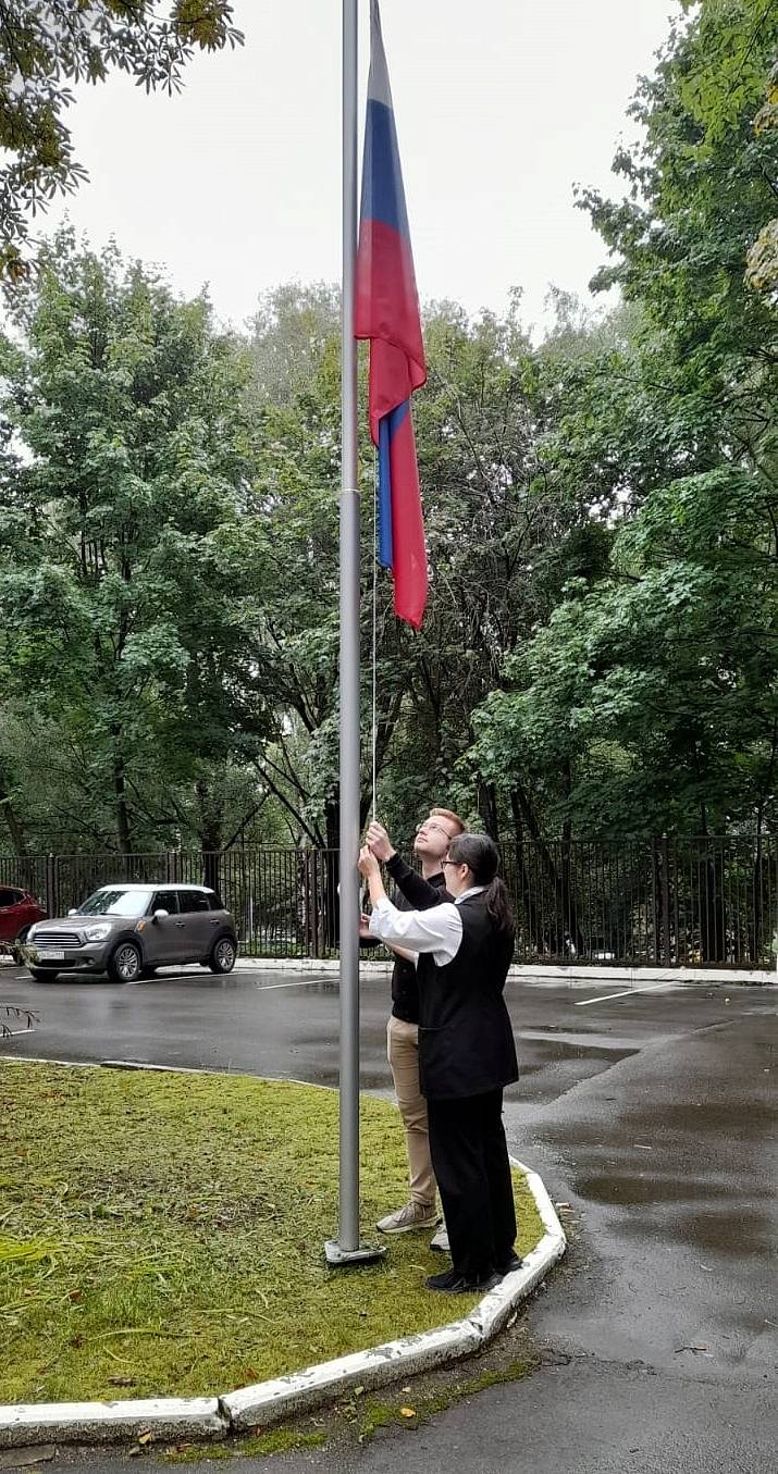 Утром во внутреннем дворе Академии перед центральным входом в здание, над которым развевается государственный флаг Российской Федерации, под звуки государственного гимна России состоялась торжественная церемония поднятия российского триколора с участием представителей ректората, преподавателей и сотрудников Академии, студентов и иностранных слушателей. Флаг поднимали студенты, активисты Студенческого совета, Студенческого парламентского клуба РГАИС и патриотического клуба Академии «Я горжусь!» Алина Артикова и Дмитрий Храмченков.