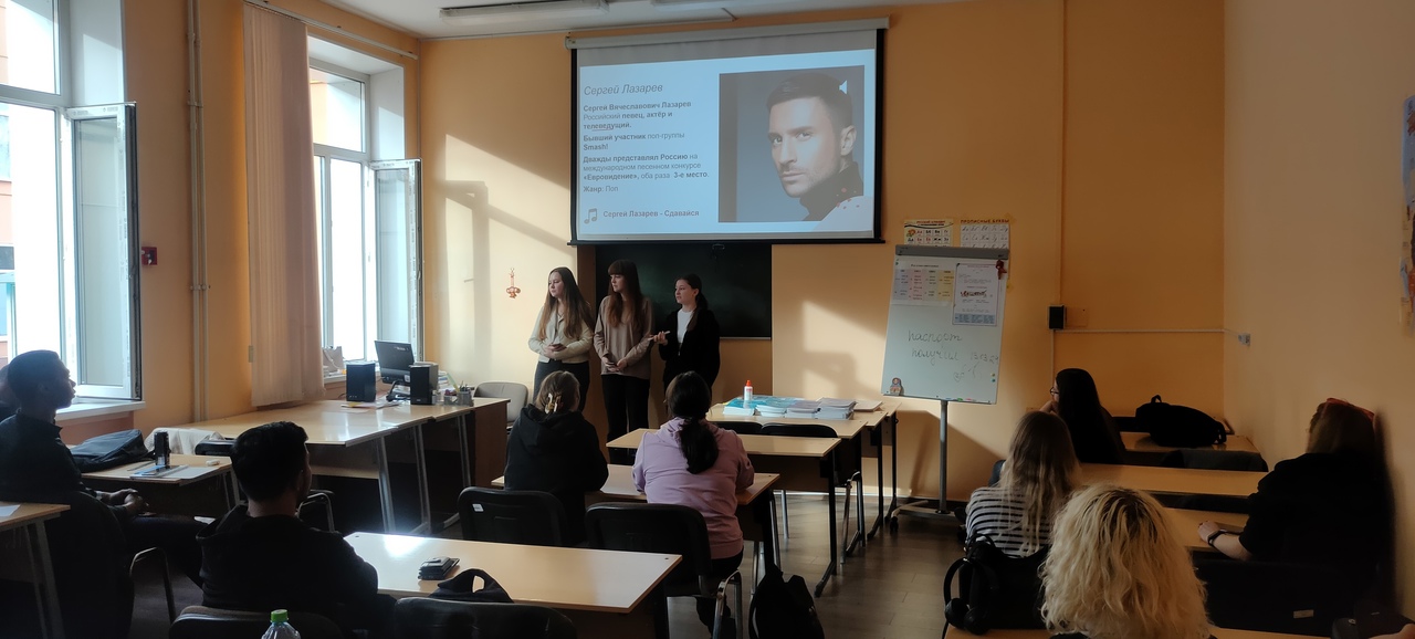 Для представителей разных культур песня – не только источник знаний о другом народе, но и способ найти друзей по общим музыкальным интересам! Так, 1 апреля прошла вторая встреча разговорного клуба «Диалог культур», посвященная теме музыкальной культуры России. Студентки 2 курса факультета Управления интеллектуальной собственностью познакомили иностранцев с наиболее популярными российскими певцами современной музыкальной индустрии, среди которых были представлены Полина Гагарина, Сергей Лазарев, Григорий Лепс, Дмитрий Билан и многие другие. Иностранных обучающихся особенно впечатлил народный артист РФ Олег Газманов как пример настоящего патриота, а также сильного телом и духом человека!