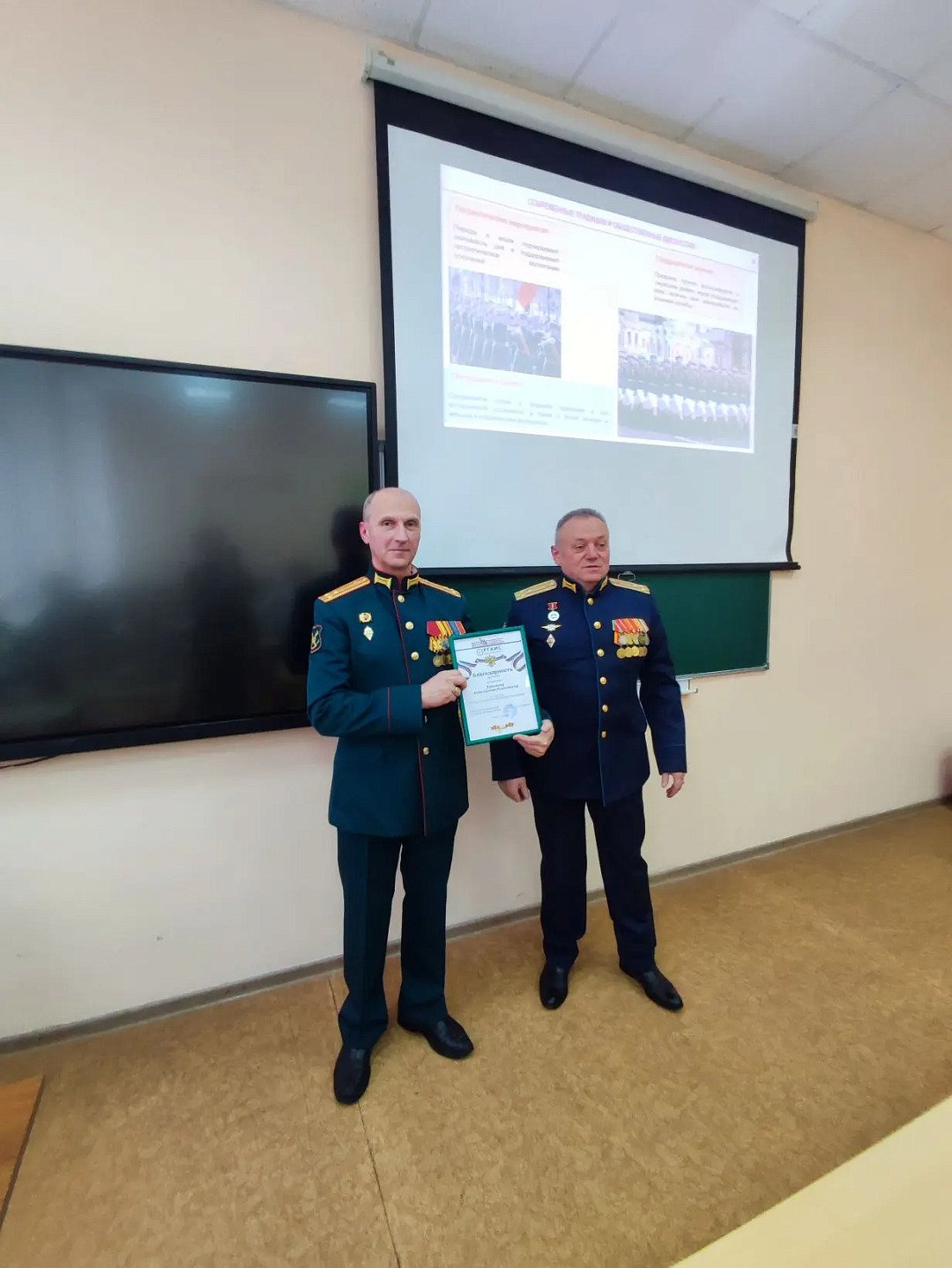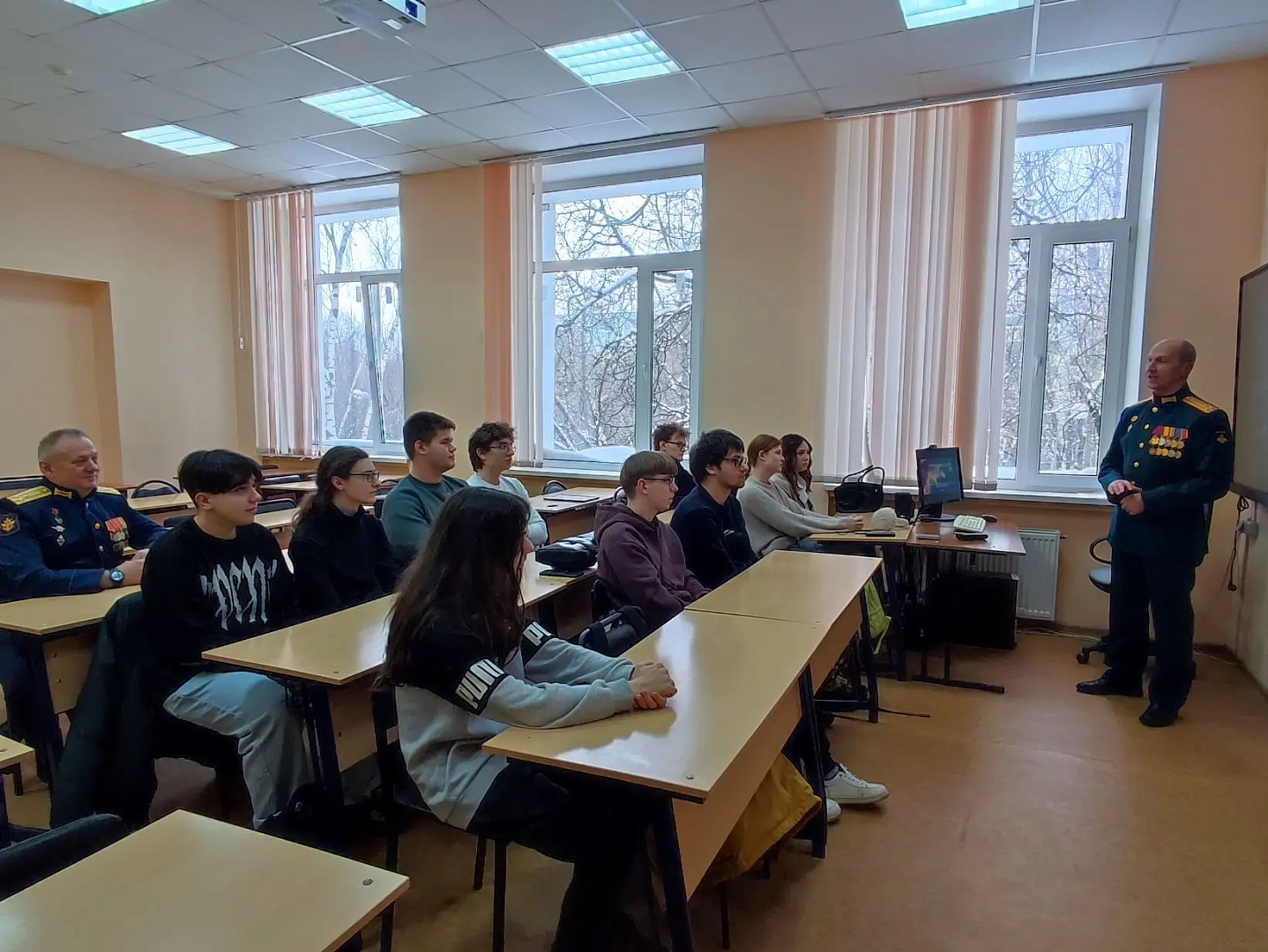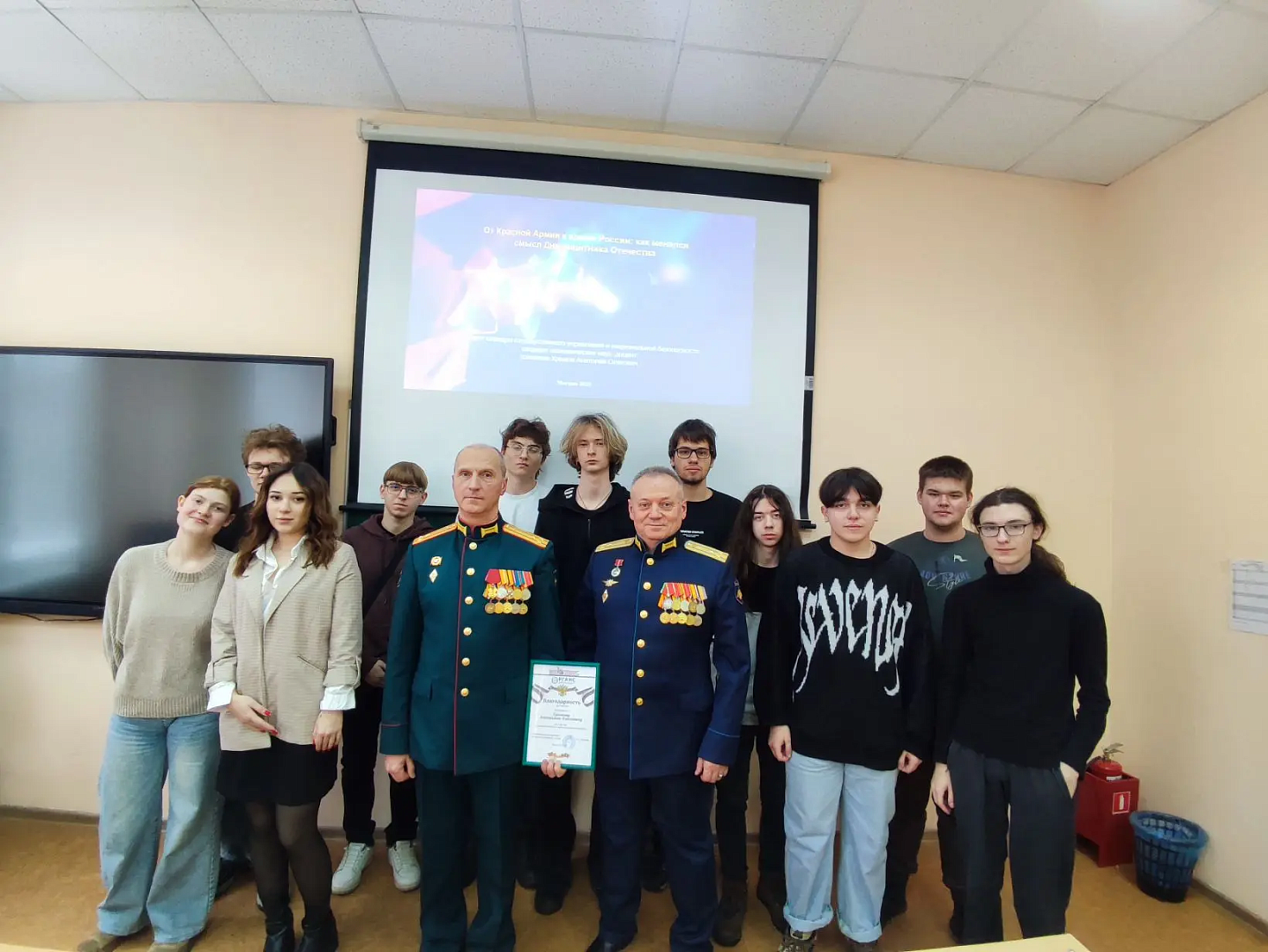 Полковник Хромов рассказал студентам об историческом значении Красной армии и роли Дня защитника Отечества. Он подчеркнул, как героизм современного поколения, проявленный в том числе во время специальной военной операции, продолжает страницы истории. Обсуждались также вопросы сохранения воинских традиций, преемственности поколений в семьях и увековечивания памяти героев.