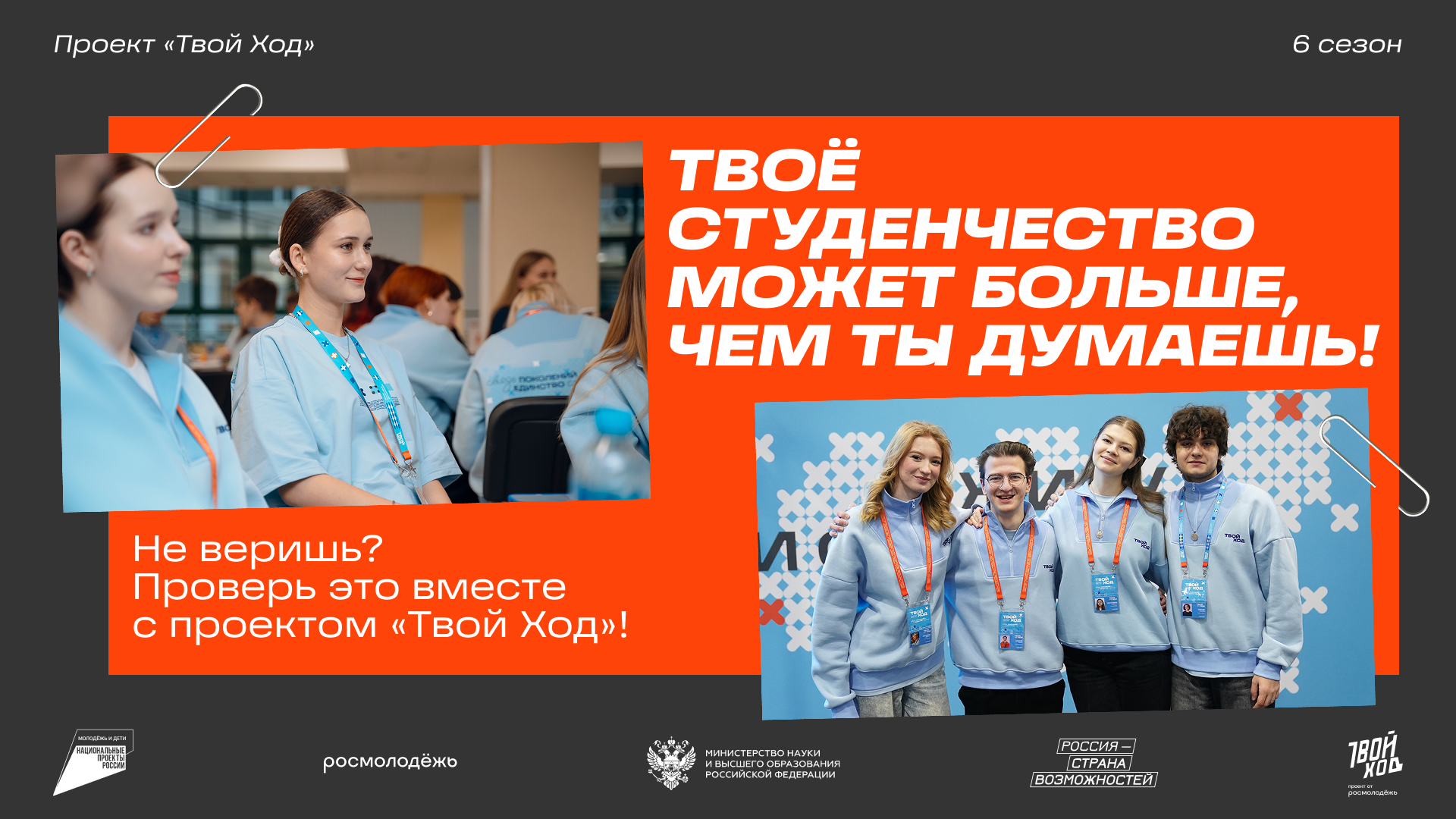 «Твой Ход» является частью национального проекта «Молодёжь и дети», при поддержке Министерства науки и высшего образования РФ. Это единое движение молодых лидеров и инициативных студентов со всей России.
