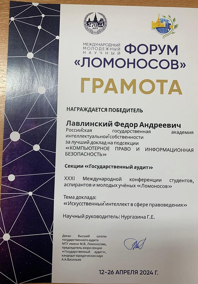 Студент 1 курса факультета УИС, активный участник СНО Федор Лавлинский стал победителем научного конкурса работ, выступив с докладом «Искусственный интеллект в сфере правоведения» в подсекции «Компьютерное право и информационная безопасность» (научный руководитель – доцент кафедры ЦЭиП Нургазина Г.Е.).