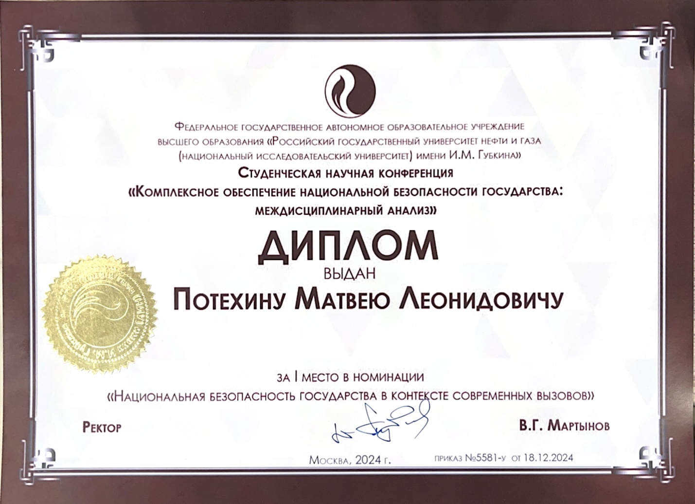 От всей души поздравляем Матвея с достигнутым блестящим результатом и благодарим Лабораторию правовых исследований в сфере национальной безопасности РГУ нефти и газа имени И.М. Губкина за организацию конференции на столь актуальную тему!