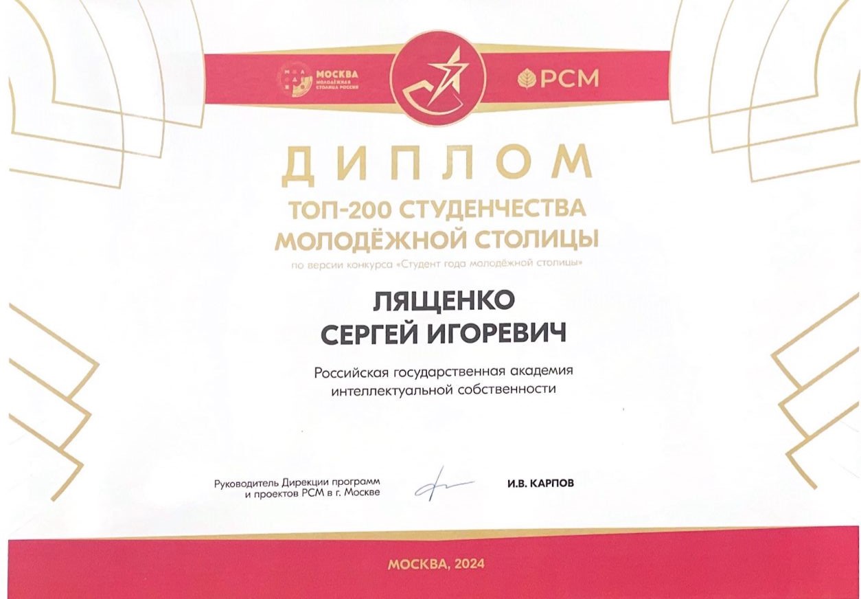 18 октября на сцене Конгресс-центра РЭУ имени Г.В. Плеханова состоялось подведение итогов прошедшего 1 октября очного этапа конкурса «Студент года молодежной столицы», в котором Академию блестяще представили победители его заочного тура, активисты СНО РГАИС Малена Стаценко (Юридический факультет) и Сергей Лященко (факультет Управления интеллектуальной собственностью).