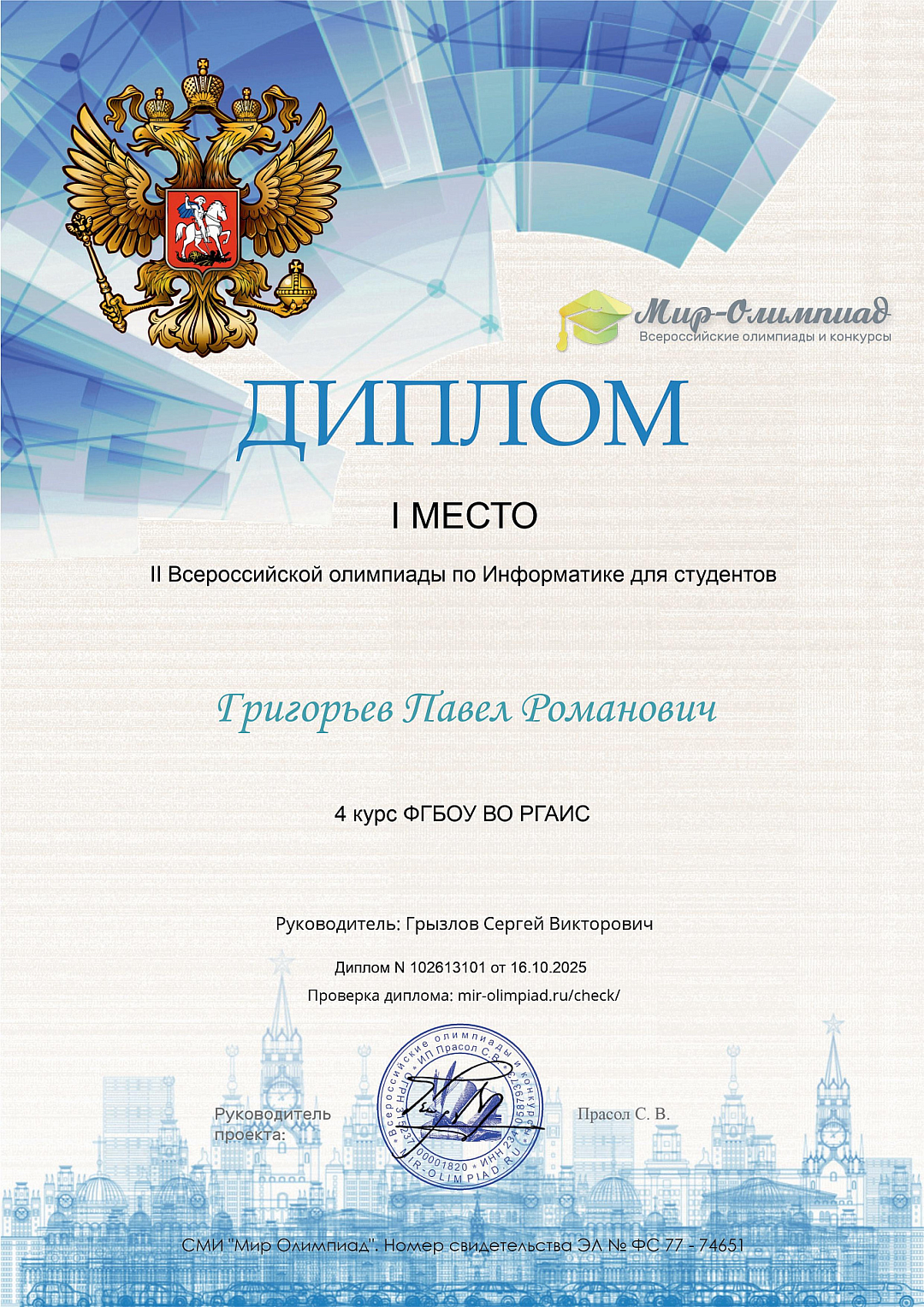Студент Факультета Управления интеллектуальной собственностью РГАИС Павел Григорьев блестяще выступил на II Всероссийской олимпиаде по Информатике для студентов и занял первое место!