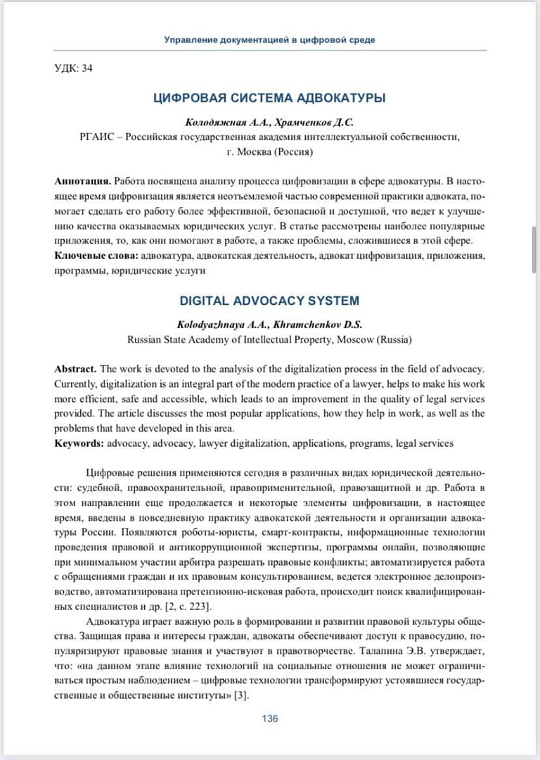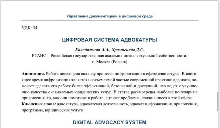 Научные статьи студентов первого курса Юридического факультета прошли отбор и опубликованы в сборнике материалов по итогам VI национальной научно-практической конференции «Управление документацией в цифровой среде», организованной кафедрой документоведения, истории государства и права РТУ МИРЭА.