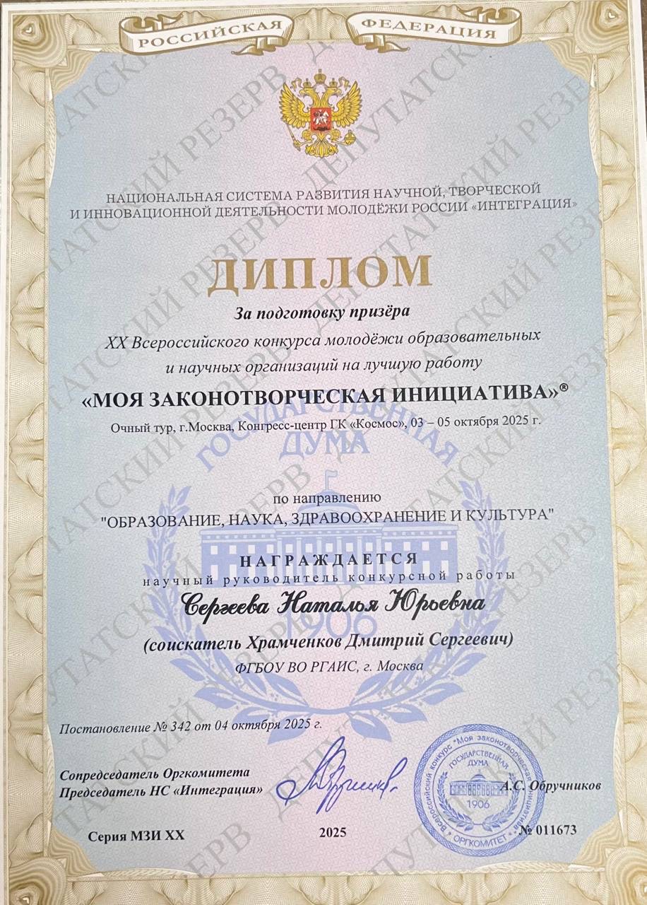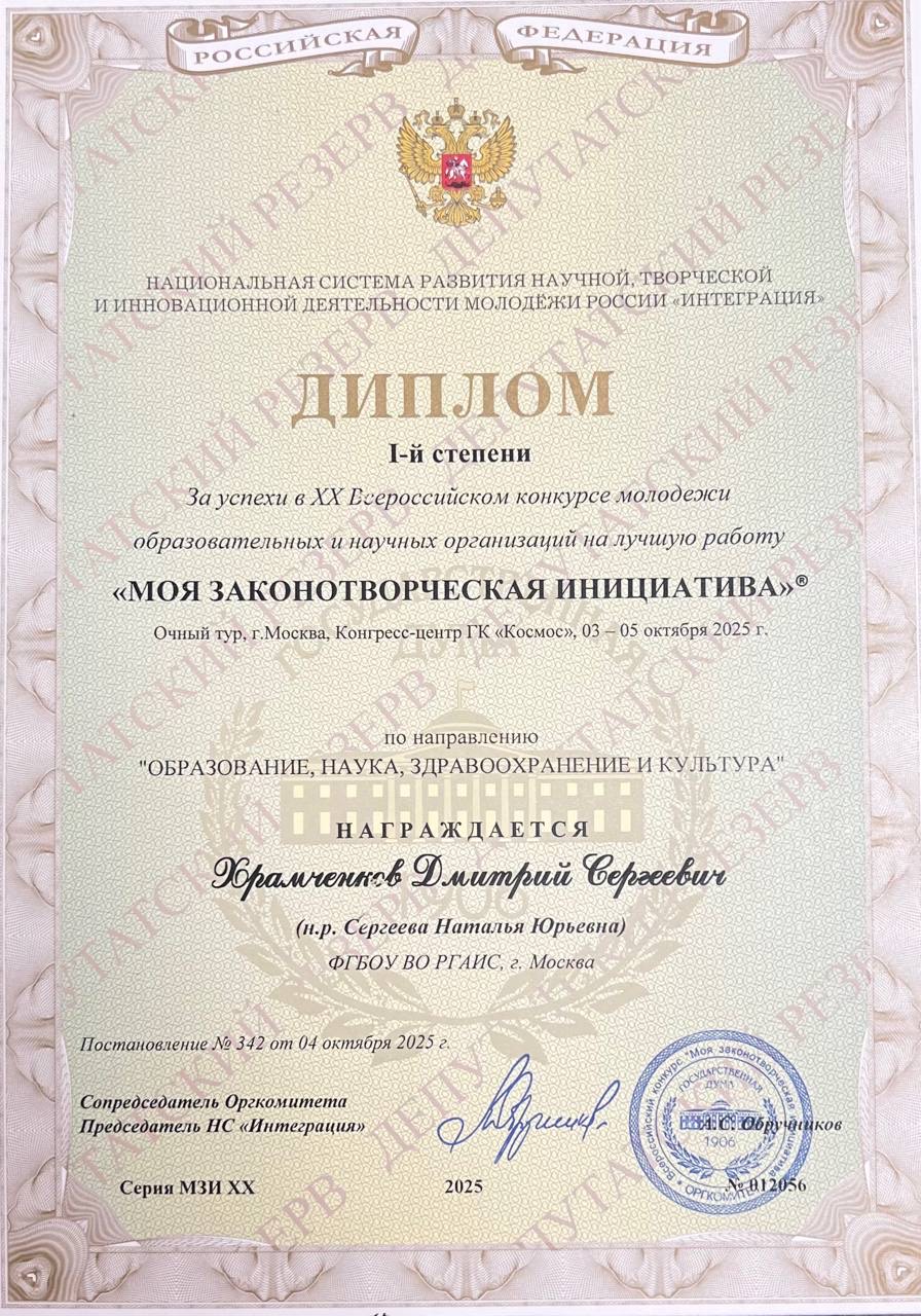 По итогам XX Всероссийского конкурса молодежи образовательных и научных организаций на лучшую работу «МОЯ ЗАКОНОТВОРЧЕСКАЯ ИНИЦИАТИВА», прошедшего 4 октября 2025 года в Конгресс-центре ГК «Космос», студент 3 курса Юридического факультета, активист СНО «Эксперт» Юридического факультета РГАИС – Храмченков Дмитрий стал призером конкурса, блестяще представил Академию и награжден дипломом I степени!