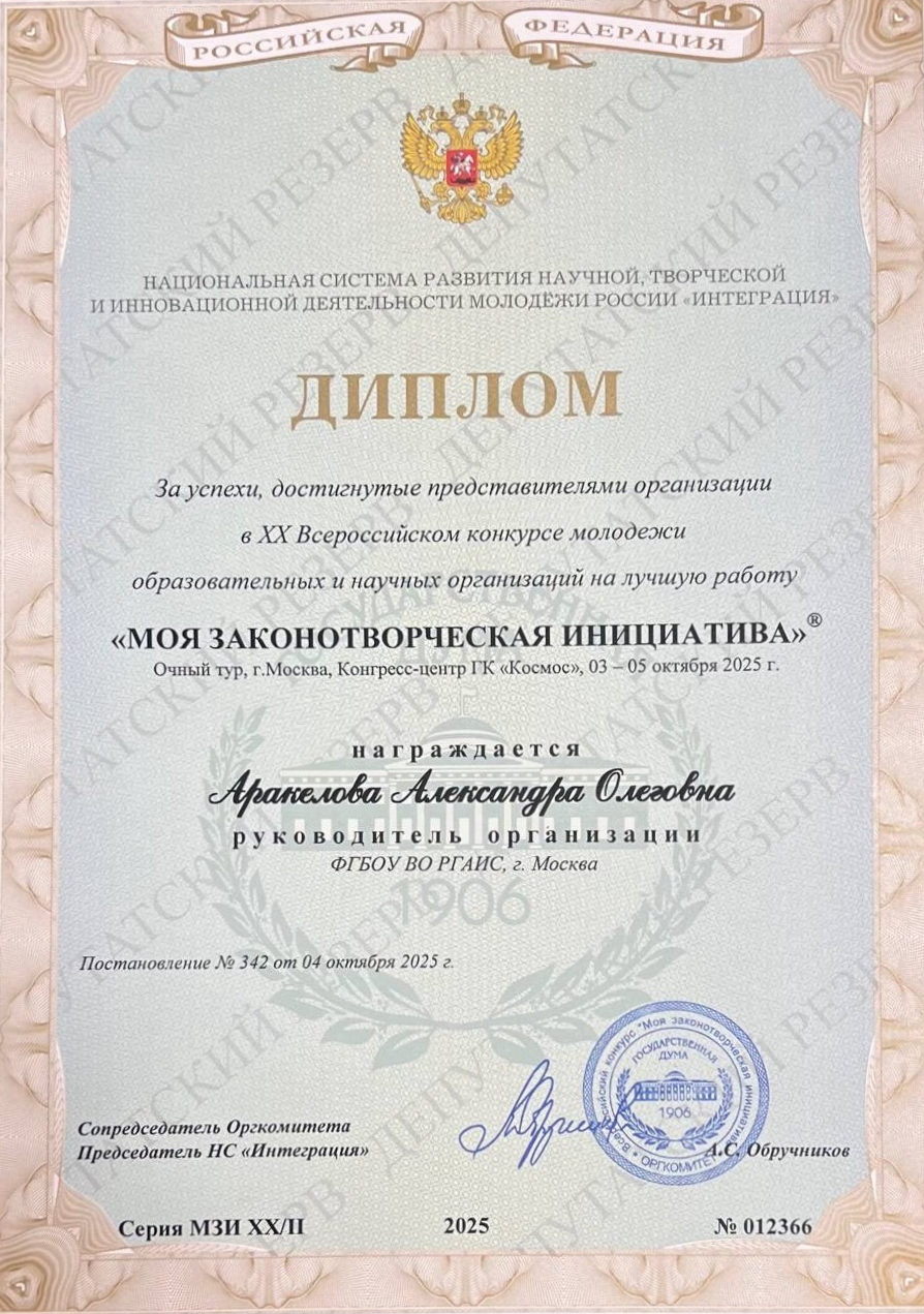 За успехи, достигнутые представителями РГАИС в XX Всероссийском конкурсе молодежи образовательных и научных организаций на лучшую работу «МОЯ ЗАКОНОТВОРЧЕСКАЯ ИНИЦИАТИВА» награждена дипломом ректор Академии – Аракелова Александра Олеговна.