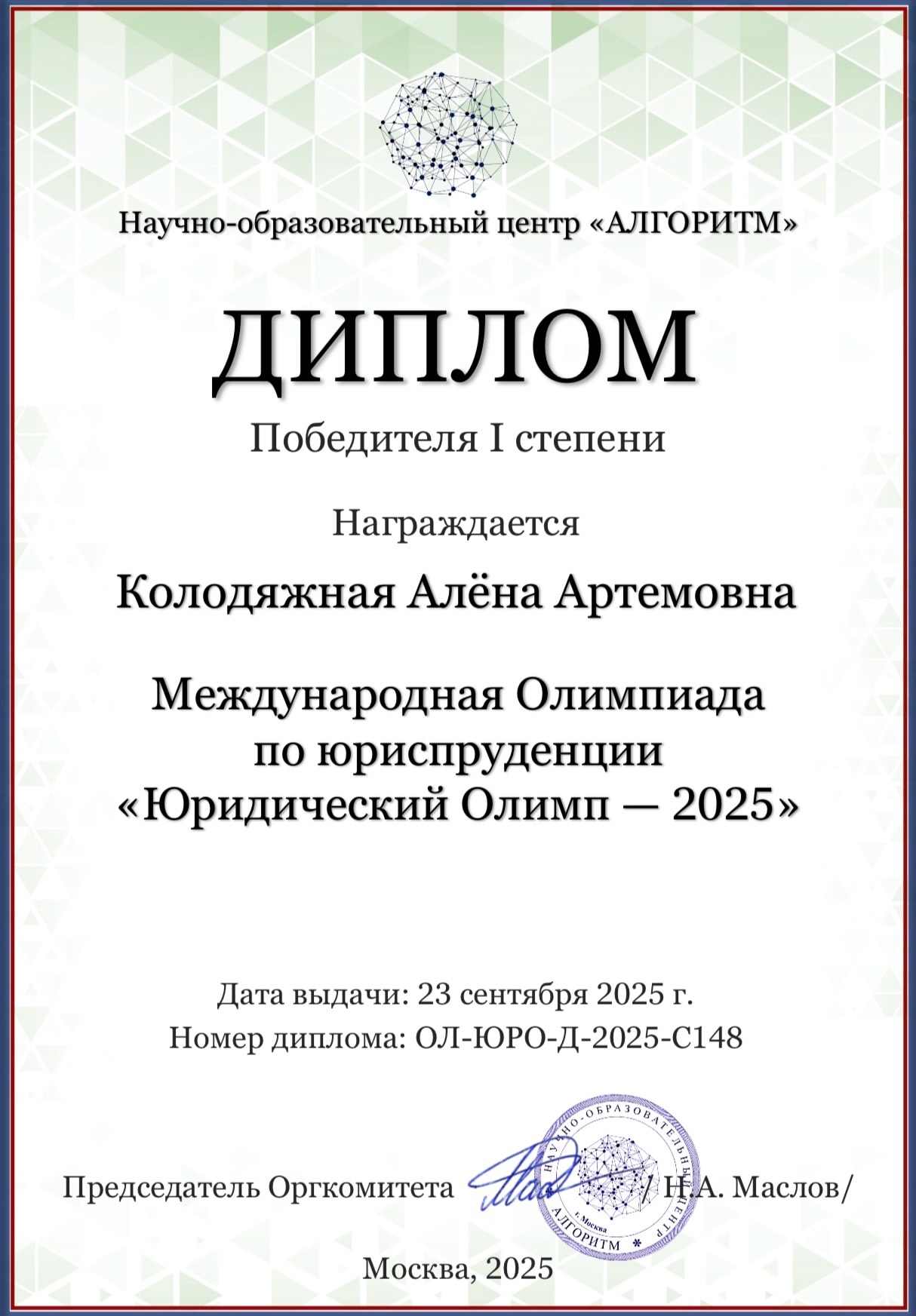 С 1 сентября по 22 сентября в научно-образовательном центре «Алгоритм» прошла Международная Олимпиада по юриспруденции «Юридический Олимп – 2025».