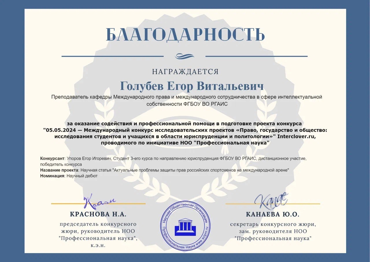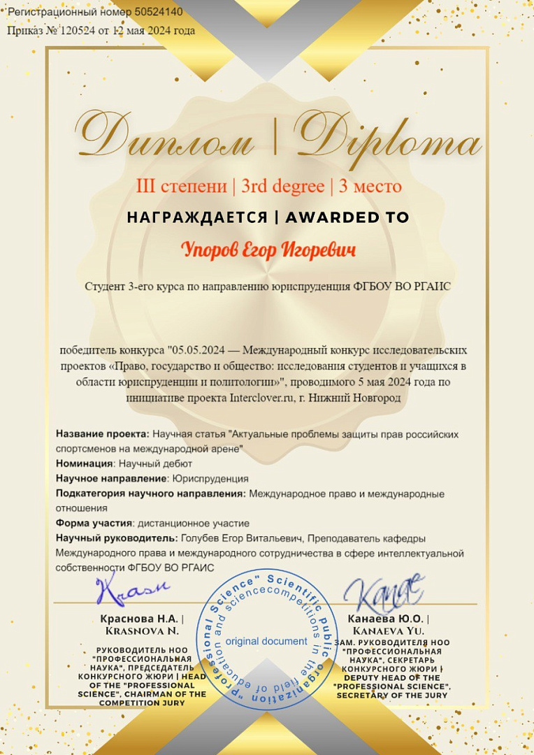 Научная статья Егора была посвящена проблемам защиты прав российских спортсменов на международной арене (научный руководитель — преподаватель кафедры МПиМСвСИС Голубев Е.В.). Выступление студента получило высокую оценку от членов жюри и было удостоено третьего призового места!