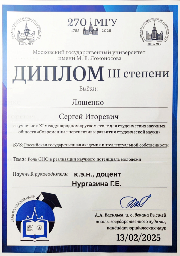 По итогам круглого стола жюри отметило наиболее яркие и содержательные доклады. Награждение победителей состоялось на Торжественном вечере, приуроченном ко Дню Российской науки. Сергей Лященко был награжден дипломом 3 степени.