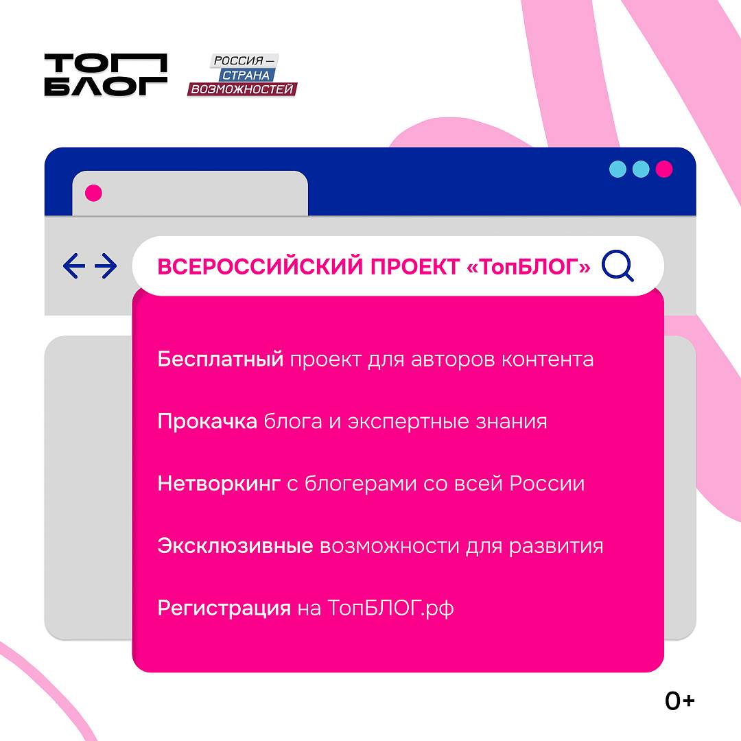 Всероссийский проект «ТопБЛОГ» реализуется в рамках федерального проекта «Россия – страна возможностей» национального проекта «Молодёжь и дети». Его цель – находить, обучать и поддерживать авторов, которые создают социальный контент в диалоге с повесткой современной России. Принять участие в проекте могут авторы контента без возрастных и географических ограничений, подав заявку на сайте проекта по ссылке на источник.